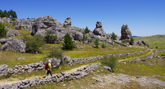 Etappe naar Courby. Over de Jonte en via oude muilezelpaadjes naar Aven Armand (zaal in de rotsen met 400 stalagmieten als uit het sprookje van 1001 nacht), eco-museum en de kaasmakerij in Hielzas tot aan het ravijn van Eyguières. Diner en overnachting in een chambres d'hotes. (5